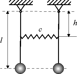 | 55.4. Два одинаковых маятника длины l и массы m каждый соединены, на уровне h упругой пружиной жесткости с, прикрепленной концами к стержням маятников. Определить малые колебания системы в плоскости равновесного положения маятников, после того как одному из маятников сообщено отклонение на угол α от положения равновесия; начальные скорости маятников равны нулю. Массами стержней маятников и массой дружины, пренебречь. Ответ: , где φ1 и φ2 отклонение маятников от вертикали и . Решение. |