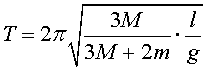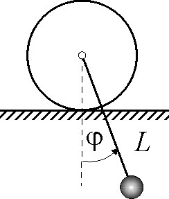| 55.5. Диск маcсы М может катиться без скольжения по прямолинейному рельсу. К центру диска шарнирно прикреплен стержень длины l, на конце которого находится точечный груз массы m. Найти период малых колебаний маятника. Массой стержня пренебречь. Ответ: . Решение. |