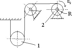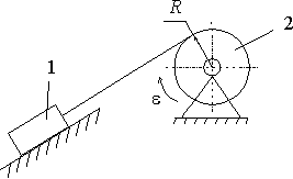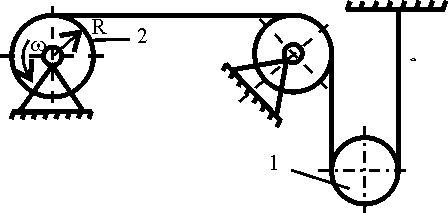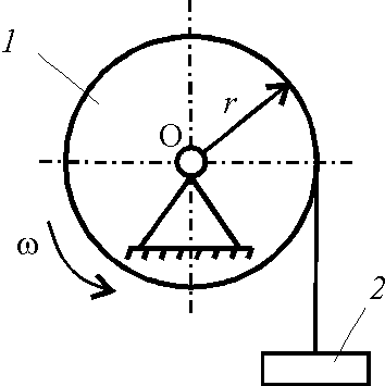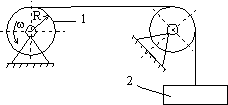 Шкив 1 радиуса R = 0,4 м, вращаясь с угловой скоростью ω = 2,5 рад/с, поднимает груз 2 массой m = 10 кг. Определить модуль количества движения груза. |