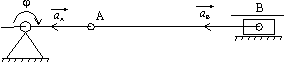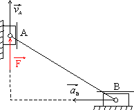 Ползун А движется под действием силы F с постоянной скоростью vA. Определить реакцию направляющей на ползун А в тот момент времени, когда ускорение ползуна Вравно ав = 4 м/с2, если масса однородного стержня АВ равна 5 кг. Массой ползунов пренебречь. |