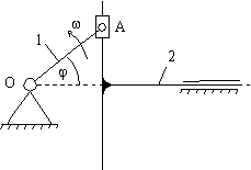 Кривошип 1 длиной ОА = 0,2 м вращается с угловой скоростью ω = 20 рад/с. Определить модуль количества движения шатуна 2 массой m = 6 кг в момент времени, когда угол φ = 90°. Шатун 2 считать однородным стержнем. |