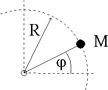 Материальная точка М массой 0,5 кг движется по окружности радиуса R = 2 м. Определить количество движения этой точки в момент времени t = π с, если угол φ = 5 sin 2t. |