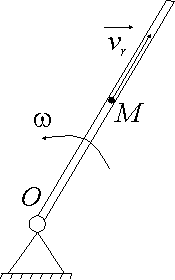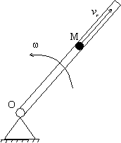 Трубка вращается с угловой скоростью ω = 10 рад/с. Относительно трубки движется шарик М массой m = 0,2 кг со скоростью = 4 м/с. Определить модуль количества движения шарика в момент времени, когда расстояние ОМ = 0,4 м. Ответ округлить до сотых. |