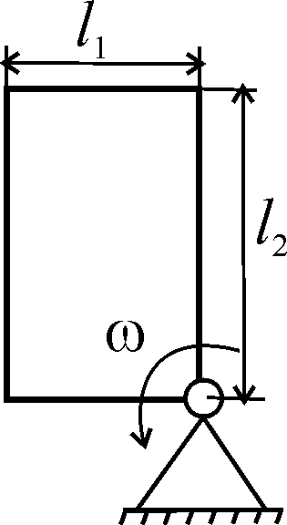 Однородная прямоугольная пластина массой m = 12 кг вращается с угловой скоростью ω = 10 рад/с. Определить модуль количества движения пластины, если размеры l1 = 0,6 м, l2 = 0,8 м. |