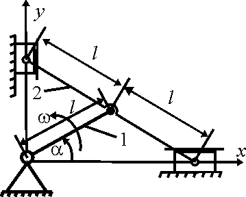 Определить проекцию на ось Оу вектора количества движения однородного стержня 2 массой m = 4 кг в момент времени, когда кривошип 1 вращается с угловой скоростью ω = 10 рад/с и угол α = 60°. Длина l = 0,2 м.
