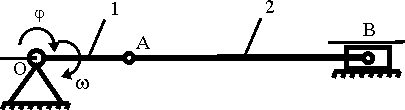 Кривошип 1 длиной ОА = 0,2 м вращается с угловой скоростью ω = 20 рад/с. Определить модуль количества движения шатуна 2 массой m = 6 кг в момент времени, когда угол φ = 90°. Шатун 2 считать однородным стержнем.