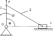 Определить проекцию на ось Оу вектора количества движения однородного стержня 2 массой m = 4 кг в момент времени, когда кривошип 1 вращается с угловой скоростью ω = 10 рад/с и угол α = 60°. Длина l = 0,2 м. |