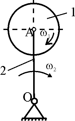 Кривошип 2 длиной ОА = 1 м вращается с угловой скоростью ω = 10 рад/с. Относительно кривошипа вращается однородный диск 1 массой m1 = 10 кг с угловой скоростью ω1. Определить модуль количества движения системы, считая кривошип 2 однородным стержнем массой m2 = 5 кг. |