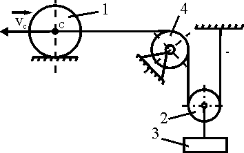 Определить модуль количества движения механической системы, если центр масс С цилиндра 1 движется со скоростью vC = 4 м/с, а массы тел 1, 2 и 3 равны соответственно m1 = 40 кг, m2 = 10 кг, m3 = 12 кг. Тела 2 и 4 — однородные диски. Ответ округлить до целых. |