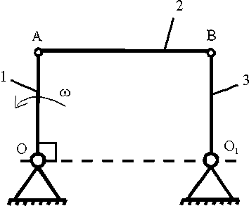 Звено 1 длиной ОА = 1 м шарнирного параллелограмма ОАВО1 вращается с угловой скоростью ω = 20 рад/с. Определить модуль количества движения механизма в указанном положении. Звенья 1, 2 и 3 считать однородными стержнями, массы которых m1 = m2 = m3 = 4 кг.