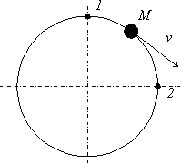 Материальная точка М массой m = 1 кг равномерно движется по окружности со скоростью v = 4 м/с. Определить модуль импульса равнодействующей всех сил, действующих на эту точку за время ее движения из положения 1 в положение 2. Ответ округлить до сотых. |