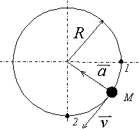 Материальная точка М массой m = 1 кг равномерно движется по окружности радиуса R = 0,5 м со скоростью v. Ускорение точки а = 8 м/с2. Определить модуль импульса равнодействующей всех сил, действующих на эту точку за время ее движения из положения 1 в положение 2. Ответ округлить до сотых. |