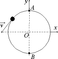 Материальная точка массой 0,5 кг движется по окружности с постоянной скоростью v = 2 м/с. Найти проекцию на ось Ох импульса равнодействующей всех сил, действующих на точку, за время ее движения из положения А в положение В. |
