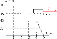 Тело массой m = 10 кг скользит по горизонтальной плоскости под действием силы F постоянного направления, значение которой меняется по закону, показанному на рисунке. Определить скорость тела в момент времени t = 5 с, если коэффициент трения скольжения f = 0,2, начальная скорость v0 = 0. Ответ округлить до десятых. |