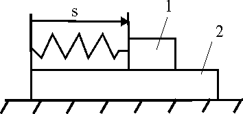 Тело 1 массой 2 кг под действием пружины движется относительно тела 2 массой 8 кг по закону s = 0,2 + 0,05·соs πt. Тело 2 может скользить по горизонтальным направляющим. Определить скорость тела 2 в момент времени t = 2 с, если оно начало двигаться из состояния покоя.