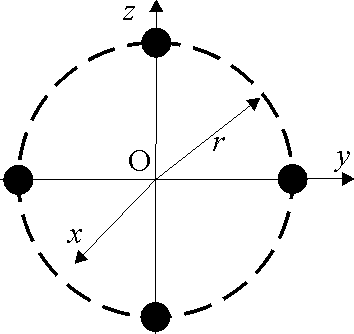 Определить момент инерции относительно плоскости Оху механической системы, состоящей из четырех одинаковых материальных точек, если масса каждой точки m = 1,5 кг , а радиус r = 0,4 м. Ответ округлить до сотых. |