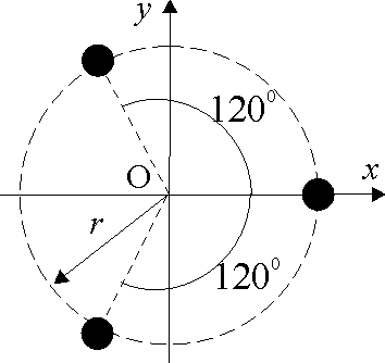Определить момент инерции относительно оси Оу механической системы, состоящей из трех одинаковых материальных точек, если радиус r = 0,6 м, а масса каждой точки m = 3 кг. Ответ округлить до сотых. |