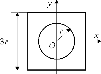 Определить момент инерции относительно центральной оси Оу однородной тонкой квадратной пластины массой m = 0,3 кг, имеющей отверстие радиуса r = 0,04 м. |