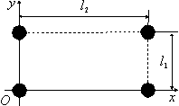 Определить центробежный момент инерции механической системы, состоящей из четырех одинаковых материальных точек, относительно осей Ох, Оу, если расстояния l1 = 0,4 м, l2 = 0,8 м, а масса каждой точки m = 2 кг. Ответ округлить до сотых.