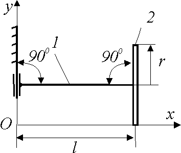 Механическая система состоит из однородного тонкого стержня 1 массой. m1 = 0,4 кг и однородного тонкого диска 2 массой m2 = 2 кг. Определить момент инерции этой системы относительно оси Оу, если радиус r = 0,1 м, а длина l = 0,3 м. Ответ округлить до тысячных. |