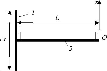 Определить момент инерции конструкции, состоящей из однородных стержней 1 и 2, относительно оси Оz, если массы стержней m1 = 2 кг, m2 = 1 кг, а размеры l1 = 0,6 м, l2 = 0,9 м. Ответ округлить до сотых.