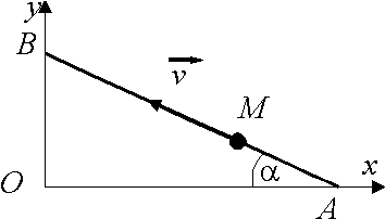 Материальная точка М массой m = 0,5 кг движется со скоростью v = 2 м/с по прямой АВ. Определить момент количества движения точки относительно начала координат, если расстояние ОА = 1 м и угол α = 30°. Ответ округлить до десятых.