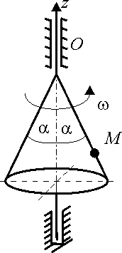 Конус вращается равномерно вокруг оси Аz с угловой скоростью ω = 4 рад/с. По образующей конуса движется материальная точка М массой 1 кг. Определить момент количества движения материальной точки относительно оси 0z в положении, когда расстояние ОМ = 1 м, если угол α = 30°.
