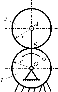 Кривошип ОА вращается с постоянной угловой скоростью ω = 6 рад/с. Колесо 2 катится по неподвижному колесу 1. Определить кинетический момент колеса 2 относительно его мгновенного центра скоростей К, если радиус r = 0,15 м. Колесо 2 считать однородным диском массой m = 3 кг. Ответ округлить до сотых.