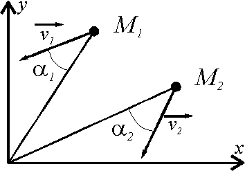 В плоскости Оху движутся материальные точки М1 и М2, массы которых m1 = m2 = 1 кг. Определить кинетический момент данной системы материальных точек относительно точки O в положении, когда скорости v1 = 2 v2 = 4 м/c ряccтoяния OM1 = 2 OM2 = 4 м и углы α1 = α2 = 30°.