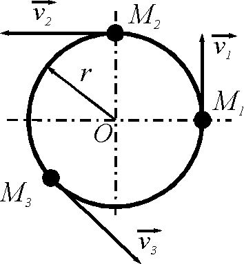 Материальные точки М1, М2, М3, массы которых m1 = m2 = m3 = 2 кг , движутся по окружности радиуса r = 0,5 м. Определить кинетический момент системы материальных точек относительно центра 0 окружности, если их скорости v1 = 2 м/с, v2 = 4 м/с, v3 = 6 м/с.