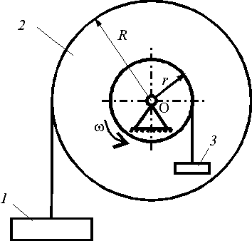 На барабан 2, момент инерции которого относительно оси вращения I = 0,05 кг·м2, намотаны нити, к которым прикреплены грузы 1 и 3 массой m1 = 2 m2 = 2 кг. Определить кинетический момент системы тел относительно оси вращения, если угловая скорость ω = 8 рад/с, радиусы R = 2 r = 20 см. Ответ округлить до сотых.