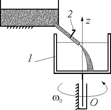 Резервуар 1, момент инерции которого относительно вертикальной оси Оz равен 1 кг·м2 , вращается с угловой скоростью ω = 18 рад/с. После открытия задвижки 2 он заполняется сыпучим материалом. Определить угловую скорость заполненного резервуара, если его момент инерции равен 3 кг·м2.