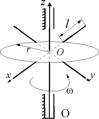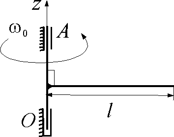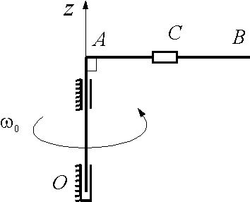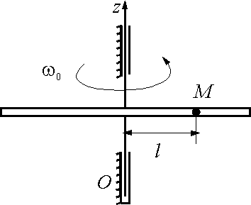 Трубка вращается вокруг вертикальной оси Оz, ее момент инерции Iz = 0,075 кг·м2. По трубке под действием внутренних сил системы движется шарик М массой m = 0,1 кг. Когда шарик находится на оси Оz, угловая скорость ω = 4 рад/с. При каком расстоянии l угловая скорость равна 3 рад/с? Ответ округлить до десятых.