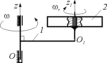 Внутренними силами системы маховик 2 массой 20 кг, центральный момент инерции которого Iz1 = 1 кг·м2, раскручивается до относительной угловой скорости ωr = 40 рад/с. Определить угловую скорость ω держателя 1, если его момент инерции Iz = 4 кг·м2, размер l = 1 м. Ответ округлить до десятых.