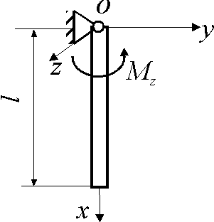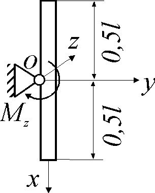 Определить угловое ускорение однородного стержня массой m = 4 кг и длиной l = 1 м, вращающегося вокруг оси Оz, если к стержню приложен вращающий момент Мz = 3 Н·м. |