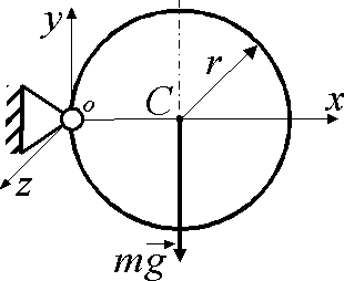 Однородный диск радиуса r = 0,1 м под действием силы тяжести начинает вращение в вертикальной плоскости вокруг горизонтальной оси Oz из положения, когда его радиус ОС горизонтален. В этот момент времени определить угловое ускорение диска. Ответ округлить до десятых. |