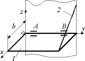 Однородная прямоугольная плита 1 массой m укреплена с помощью петель A и B и удерживается в горизонтальном положении тросом 2. Определить угловое ускорение плиты в момент обрыва троса, если ширина плиты b = 1м. Ответ округлить до десятых. |