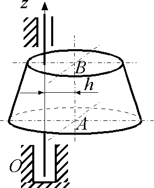 Усеченный конус массой m = 4 кг вращается с угловым ускорением ε = 6 рад/с2 вокруг нецентральной оси Оz под действием пары сил с моментом М = 24 Н·м. Определить момент инерции конуса относительно его центральной оси АВ, если расстояние между осями h = 0,2 м. Ответ округлить до сотых.