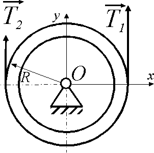 Определить радиус инерции шкива массой m = 5 кг и радиуса R = 0,4 м, если под действием сил натяжения ремня Т1 = 2 Т2 = 10 Н он вращается с угловой скоростью ω = 10 t. Ответ округлить до десятых. |