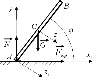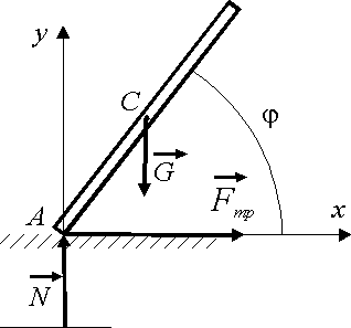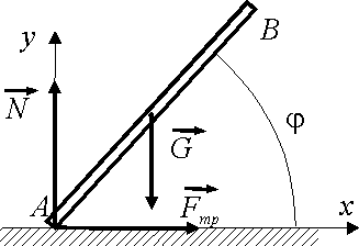 Стержень АВ массой 2 кг, скользя по горизонтальной шероховатой плоскости, начинает падать в вертикальной плоскости. При угле φ = 45° определить нормальную реакцию