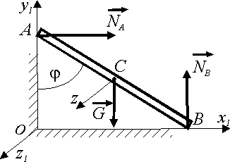 На гладкий пол и гладкую стену под углом φ = 60° опирающийся стержень массой m = 3 кг начинает скользить с ускорением центра масс ас = i - 5,5j. Определить значение нормальной реакции в точке А. Ответ округлить до целых. |