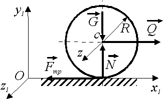 К колесу массой m = 20 кг приложили горизонтальную силу Q = 120 Н. При этом сила трения Fтр = 40 Н. Определить модуль углового ускорения ε колеса, если его радиус R = 0,3 м и момент инерции ICz = 0,9 кг·м2. Ответ округлить до десятых. |