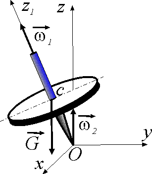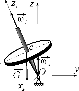 Определить угловую скорость ω2 прецессии гироскопа, если угловая скорость вращения его вокруг оси симметрии ω1 = 150 рад/с, вес G = 10 Н, момент инерции Iz1 = 0,005 кг·м2 и расстояние ОС = 0,04 м. Ответ округлить до тысячных. |