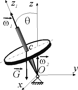 Волчок совершает регулярную прецессию с угловыми скоростями ω1 = 100 рад/с, ω2 = 1,4 рад/с; между векторами ω1 и ω2 угол θ = 5°. Определить модуль момента силы тяжести С относительно точки О, если момент инерции Iz1 = 0,1 кг·м2. Ответ округлить до сотых. |