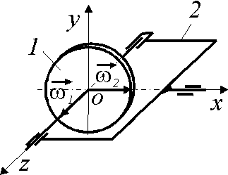 Однородный диск 1 с моментом инерции Iz = 1,5 кг·м2 вращается вокруг оси Оz с угловой скоростью ω1 = 100 рад/с. Соответственно рама 2 вращается вокруг оси Ох с угловой скоростью ω2 = 0,5 рад/с. Определить гироскопический момент.Ответ округлить до целых.