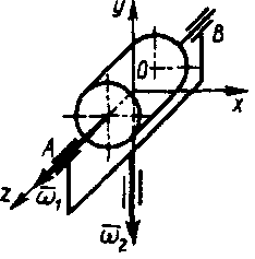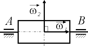 | Быстрое вращение вала с моментом инерции Iz = 10 кг·м2 осуществляется с угловой скоростью ω1 = 250k. Подшипники, в которых закреплен вал, вращаются вместе с основанием с угловой скоростью ω2 = 5k. Определить гироскопический момент. |