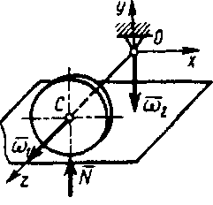 Колесо массой m = 100 кг катится по плоскости вокруг точки О с компонентами угиовой скорости ω1 = 30 рад/с и ω2 = 2,5 рад/с. Определить дополнительную реакцию N от гироскопического момента, если момент инерции IOz = 1,12 кг·м2 и расстояние ОС = 1,1 м. Ответ округлить до десятых. |