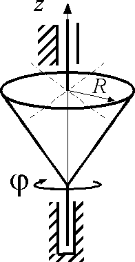 Конус, масса которого m = 10 кг, а радиус основания R = 1 м, вращается вокруг оси симметрии по закону φ = 4 sin 2t. Определить главный момент приложенных к конусу внешних сил относительно оси вращения в момент времени t = π/4 с, если момент инерции конуса Iz = 0,3 m R2. |