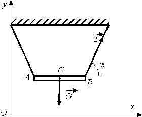 Однородный стержень длиной АВ = 1,6 м и массой m = 25 кг подвешен на двух веревках в горизонтальном положении. Определить угловое ускорение стержня в момент времени непосредственно после обрыва левой веревки, если при этом натяжение правой веревки Т = 65 Н, а угол α = 60°. Ответ округлить до сотых. Ответ округлить до сотых. |