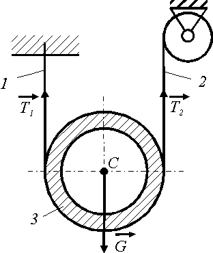 Подьем трубы 3 массой m = 700 кг осуществляется вертикальными канатами 1 и 2. Определить ускорение центра масс С, если натяжения канатов Т1 = 3504 Н и